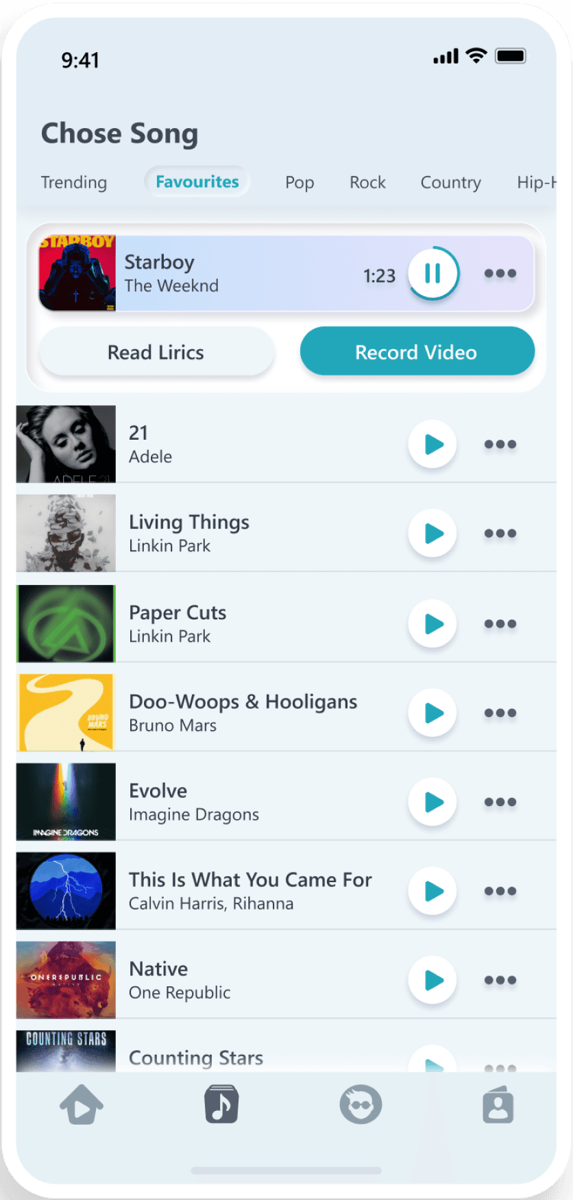 The song library went through a lot of iterations as it is also the point through which you can start a recording. We decided not to have a dedicated record button, and just show users how to start a recording. You can listen to songs and read the lyrics. There were also other ideas for seeing other performances of that song, a shorter version, but they were not for the MVP. Upon selecting a song, you move to the screen on the right which presents your avatar, the song and lyrics and a big button to start the performance.