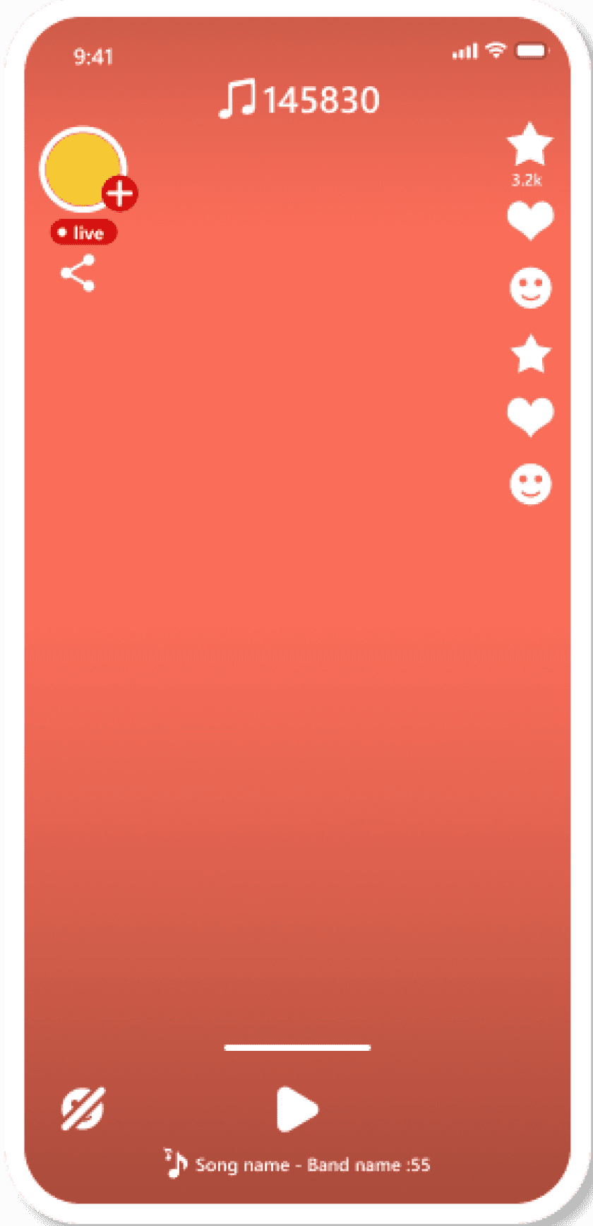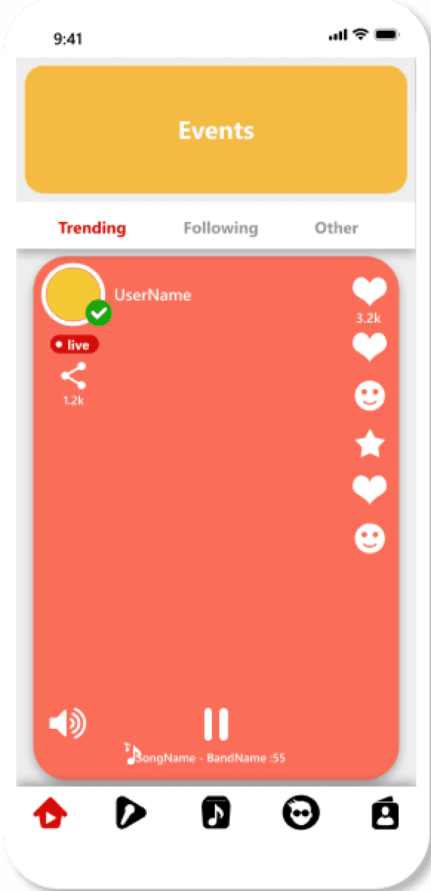 The above screens represented the home page, an endless vertical video feed with other peoples performances. You had some controls over the video, you could follow the user or react to his performance with an Emoji. No chat was implemented as we wanted to avoid any swearing for our users. We also removed the search and categories from the MVP, hoping to add this later.