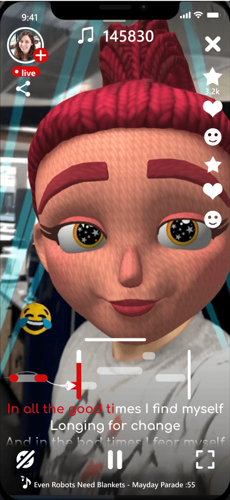 Allow users to create customisable avatars that can mimic their facial expressions and react in real time as they sing. This feature should be on both mobile platforms.